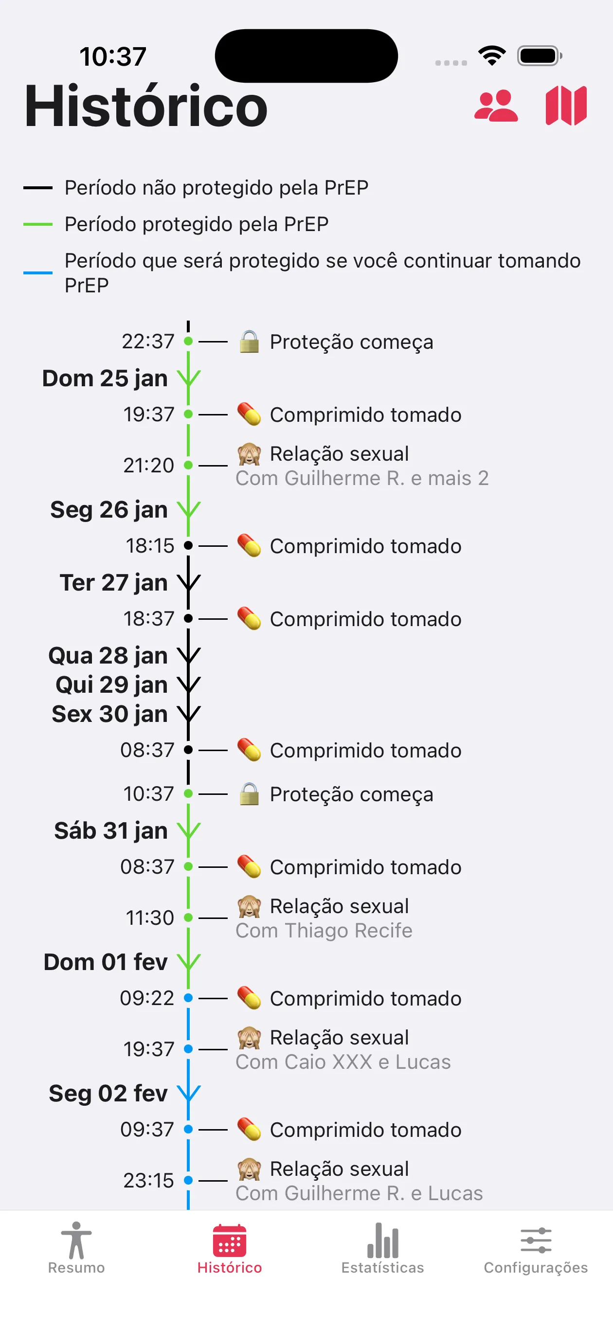Com a assinatura opcional My PrEP+, registre o histórico de seus encontros e parceiros no app para um acompanhamento completo da sua vida sexual.